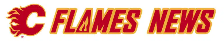 Logo for Flames Unfiltered, a hockey podcast with a city skyline and microphone.
